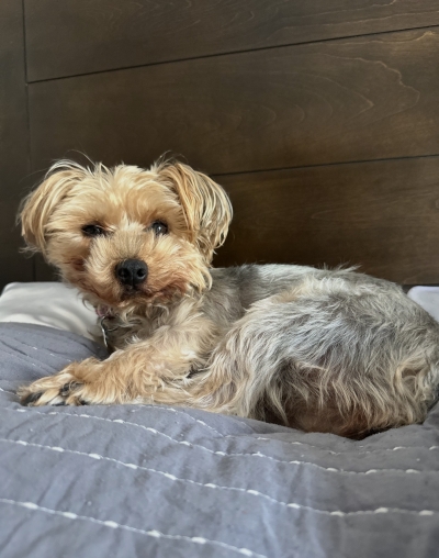 She is a golden-tan with a silver/grey back Yorkshire Terrier with a pink collar with a silver tag and her ID chip. She has tear stains from her eyes and a blue neuter tattoo on her stomach.
