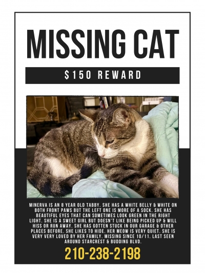 | LAST SEEN IN HELOTES, CLOSE TO 1604 AND KYLE SEAL. SHE IS FRIENDLY, HAS MICROCHIP, SKINNY, AND LOVES WET FOOD. INSIDE ONE OF HER EARS SHE HAS A GREEN TATTOO FROM WHEN SHE WAS SPRAYED.